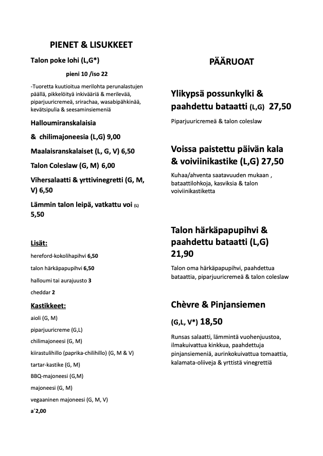 KAIKKI ANNOKSEMME ON MAHDOLLISTA VALMISTAA GLUTEENITTOMINA, BURGERIT ILMAN SÄMPYLÄÄ TAI GLUTEENITTOMAN SÄMPYLÄN KERA, F&C JA H&C ILMAN LEIVITYSTÄ PAISTETULLA KALALLA/HALLOUMILLA. ILMOITATHAN MAHDOLLISESTA KELIAKIASTA SELKEÄSTI TARJOILIJOILLEMME!
